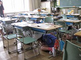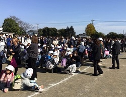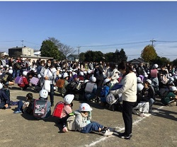 大地震が起きた場合、学校の校庭が一番安全な場所になり、児童は待機しています。
