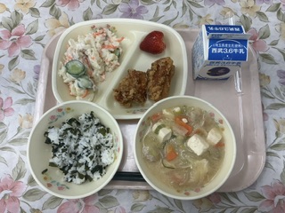 人気のわかめご飯・唐揚げ・いちごと