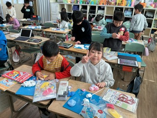 図工では、紙粘土を使って、メダルを作りました。