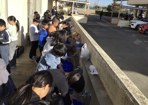 次に水道に移動して、協力しながら鉢の洗浄をしました。
