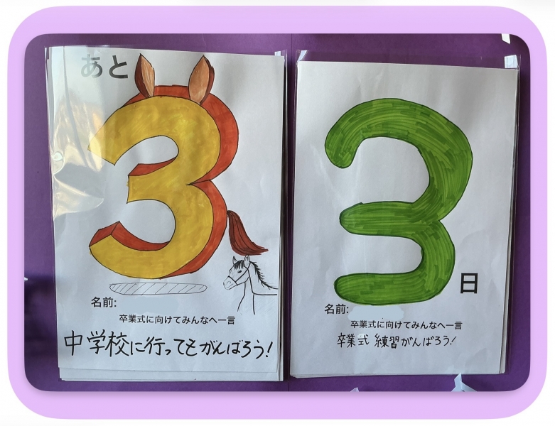 卒業式までのカウントダウンを掲示しています。登校日は残り33日。6年間通い続けた学舎との別れも、残り数日となりました。卒業までに「自分が頑張りたいこと」を日々子ども達に問いかけています。学習の復習はもちろんですが、「規律を守る」「身支度を整える」「メリハリをつける」ことを意識しながら、卒業、そして入学に向けて意識を高めてまいります。
