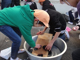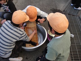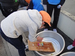 何人の保護者がわかってくれるでしょうか? 保育園の年長の時、朝の連続テレビ小説で 「おしん」を毎日見ていました。 再放送も録画して見ました。 大好きでした。 そんな「おしん」の時代を体験するために 洗濯をしました。 たらいと洗濯板を使って、自分の靴下を洗いました。 子どもたちは声にならない声で 「さむーーーーい!」「指の感覚がないよ・・・。」 と言いながら洗濯していました。 これが毎日の事となると大変ですね。 おしんプロジェクト第一弾、成功です。    |