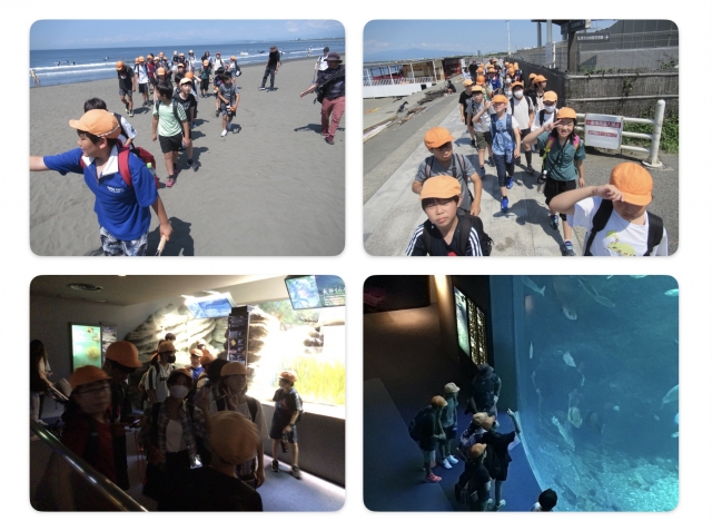 新江ノ島水族館に到着しました!浜辺で集合写真を撮り、班ごとに行動しています!