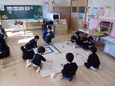 これは、鬼が指定した色をさわるという色鬼です。節分で作った鬼のお面をかぶって、本格的な鬼ごっこです。