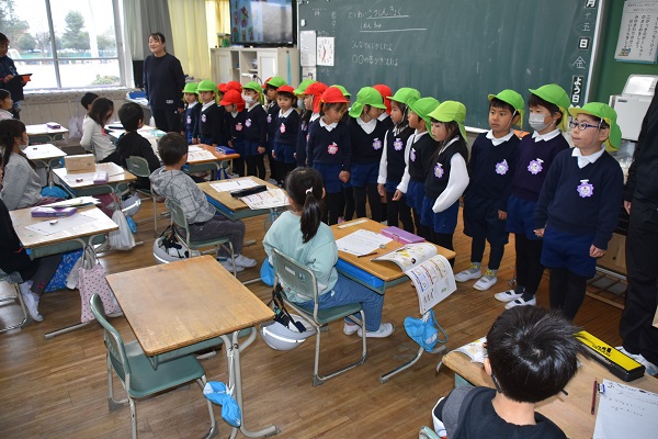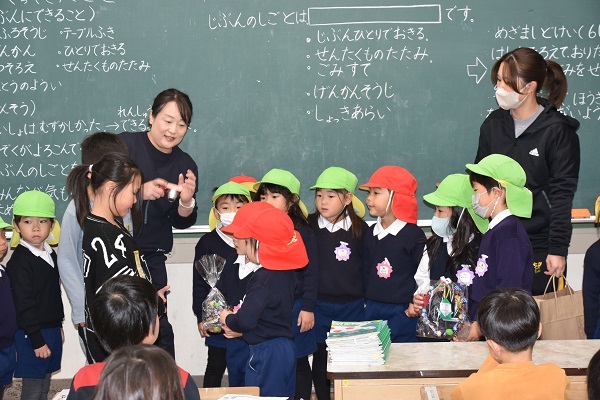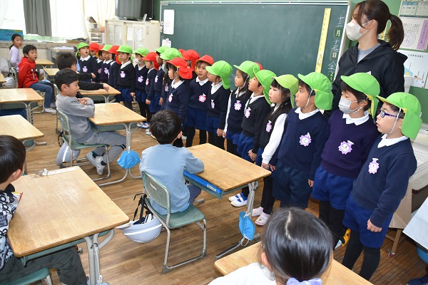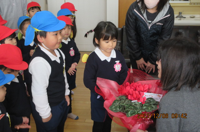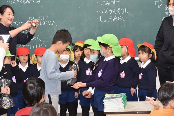 先週金曜日と本日、藤沢幼稚園の年長さん・年中さんが小学校見学に来ました。先週は校長室で挨拶、今日は1年生の各クラスをまわって手作りのリースと松ぼっくりツリーをプレゼントしてくれました。「これからも一緒に遊んでね!」「一緒に遊ぼうね」というやり取りが見られました。1年生は普段よりお兄さん・お姉さんらしく振舞っていました。