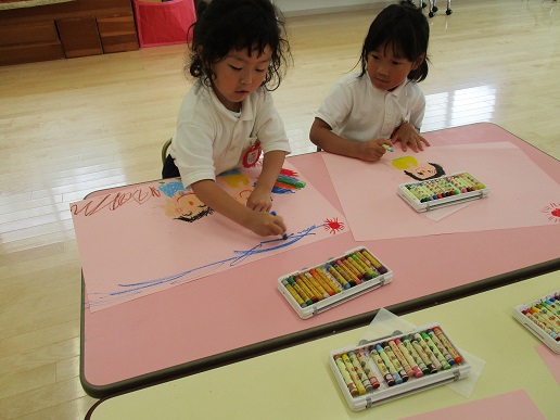 今日は、6月1日におこなった運動遊びの絵を描きました。