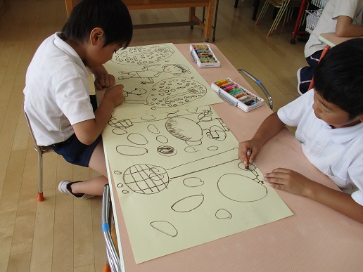 5歳児ふじ組は、こげ茶のクレヨンで絵の外枠を描き、あとから絵の具で色をつけました。