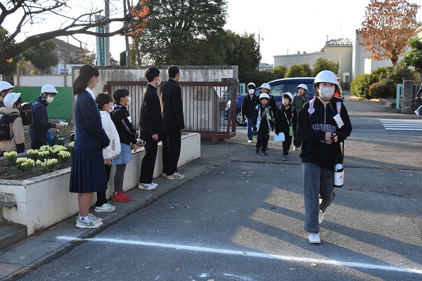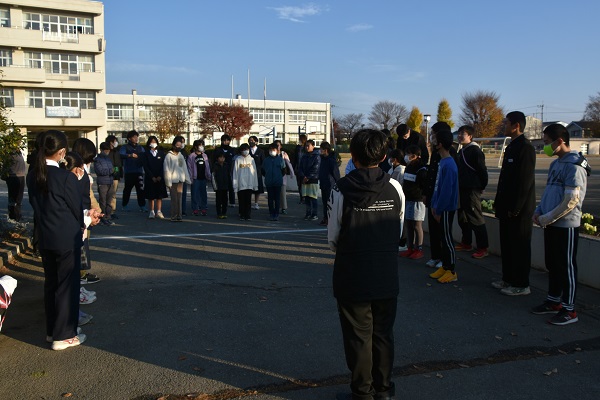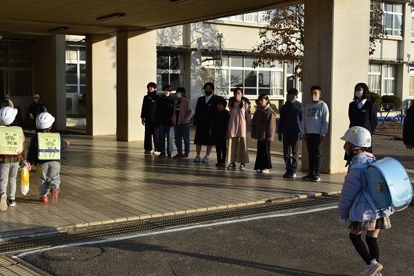 〇1,2年生の昇降口でもあいさつ。 〇最後はみんなで集まって本日の活動の振り返り。
