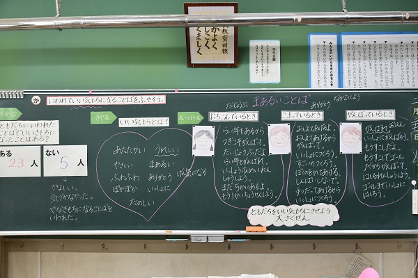 今日は1年1組で今年度の学校研究課題に係る授業がありました。内容は学活で、議題は「まあるいことばがあふれるあたたかいクラスに」でした。子どもたちは一生懸命に考えて、自分の言葉で自分の考えを伝えていました。