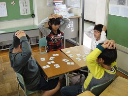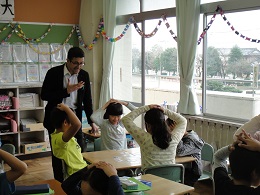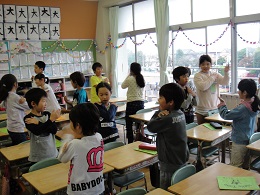 絵カードを見て、ジェスチャーをしながら大きな声で発音しました。