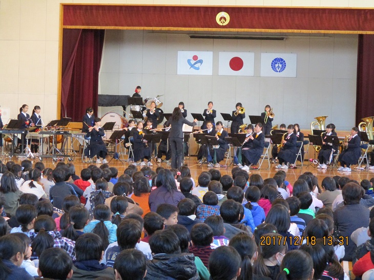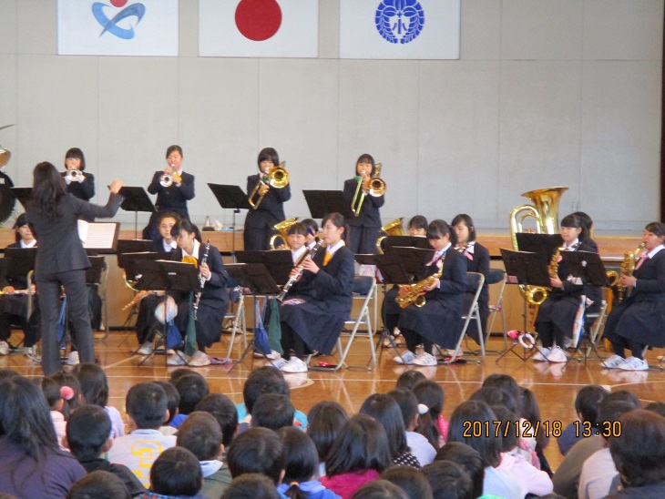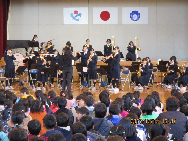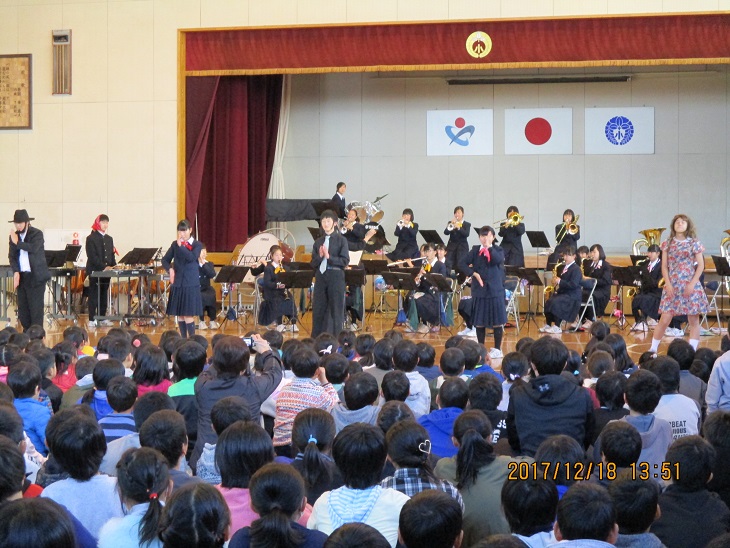 12月18日(月)の第5校時、 藤沢小学校の児童の先輩、藤沢中学校の吹奏楽部のみなさんによる、 コンサートが、藤沢小学校の体育館で、開催されました。