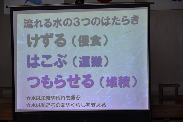 〇校庭で実験・観察をした後、体育館でまとめの学習 〇流れる水の3つの働きは・・・