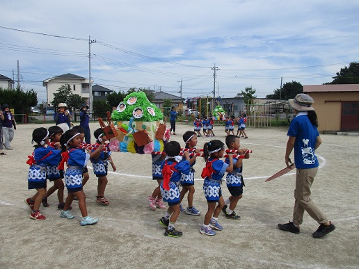 みんなで作ったお神輿を、「わっしょい、わっしょい!」と元気に掛け声をかけて担ぎました。
