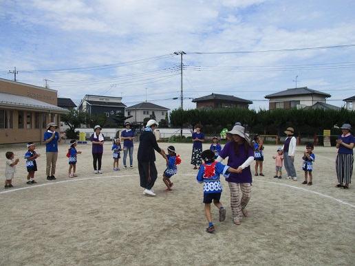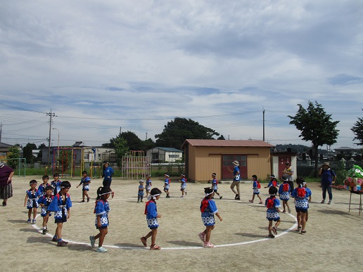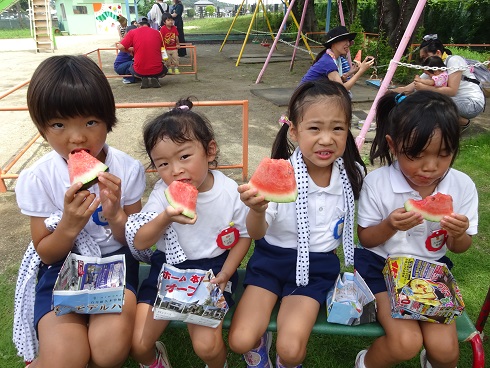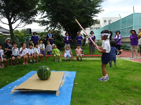 みんなでスイカ割り!!目隠しをして、みんなの声を頼りに棒を振り落とします。5歳児はちょっと難易度をあげて、目隠ししたあとにその場で3回まわってからスタート。難しいかな~と思っていましたが、ちゃんとスイカに当たる子が多くてびっくりしました!もちろん、スイカはみんなでおいしくいただきました。