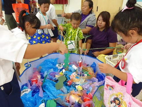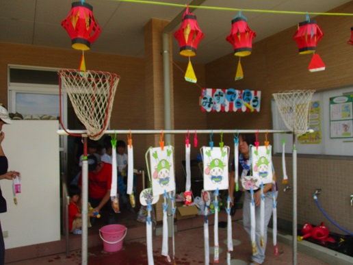 お店屋さんコーナーが開始。保護者の方の協力のもと、ヨーヨーつりや宝探し、水鉄砲、魚つり、ポップコーン屋さんなど、たくさんのお店をまわって遊んだりお土産をもらったりして楽しみました!