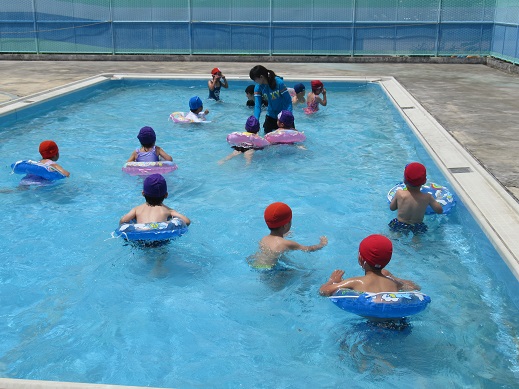 冷たい水に「きゃー!」と歓声をあげながら、みんなでバシャバシャとバタ足したり、カニさんやウサギさんに変身してプールの中を歩いたりしました。まだ、プール遊びに慣れない子や不安感をもっている子は、浮き輪を使ったりしながら、プール遊びが楽しめるようにしています。