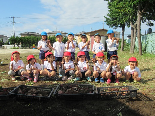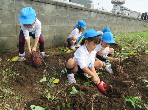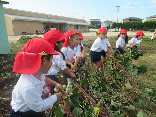 今日は、朝からみんなでさつまいも掘りをしました。さつまいもの葉っぱとつるを「うんとこしょ」とみんなで力を合わせて運んだ後、一人一人シャベルをもって、さつまいもを掘っていきました。