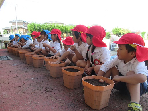 その後は、チューリップの球根を植えました。一人一鉢、自分の植木鉢に土を入れ、好きな色のチューリップの球根を選んで植えました。これから毎日、水をあげて育てていきます。早くきれいな花が咲くといいですね♪