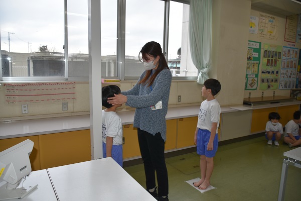 〇ちょうど1年生の身体測定でした。子どもたちの成長の早さを実感しました。