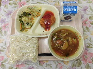牛乳 地粉うどん カレーうどん ゼリーフライ 和風サラダ今日の給食は、埼玉県行田市 の名物料理のゼリーフライ です。 見た目はコロッケですが、たくさんのおからを入れるのが特徴です。 その名前の由来 は、昔のお金の形の小判型をしている事から 「銭フライ」と呼ばれ、それがなまって「ゼリーフライ」 となったと言われています。 給食では、おから・じゃがいも・玉ねぎ・人参・ ごま・小麦粉・たまご・豆乳塩・胡椒をよく混ぜて形を整え、 素揚げしてソースにつけて食べました。 ソースは、中濃ソース・ケチャップ・みりん・水で ケチャップ味で提供しました。