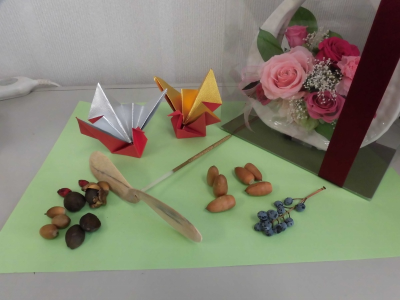 これは、校長室の棚の上の写真です。 地域の方々からいただいたものなどと一緒に、秋の校庭で拾った木の実などを飾ってあります。 いろいろなどんぐり、椿の種、ユズリハの実など、秋を楽しんでいました。