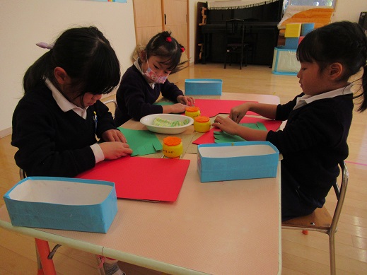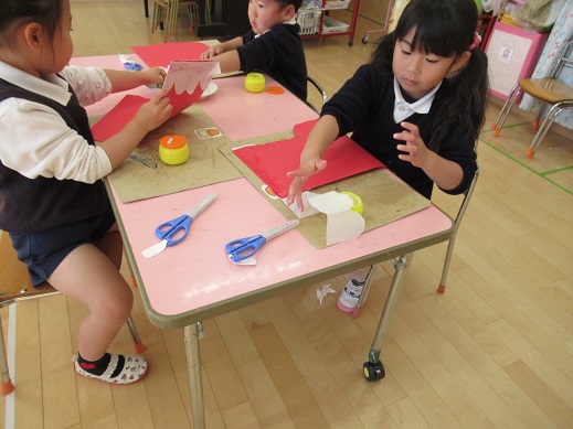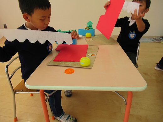 4・5歳児ともに、赤いブーツの形に切った画用紙をのり付けし、上に障子紙で飾りをつけます。