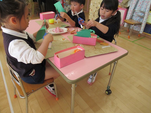 5歳児は、四角い画用紙に切り込みを入れて、それを折り込んでツリーの形を作りました。