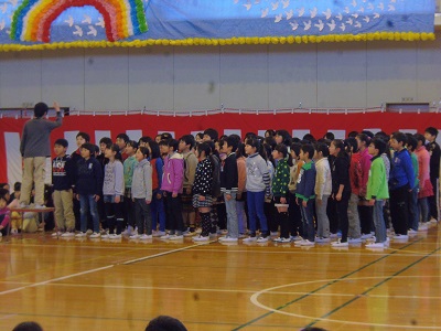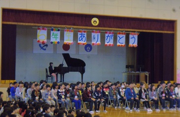 6年生を送る会を行いました。 4年生は、呼びかけと合唱を 6年生に贈りました。  「卒業 おめでとうございます!」 気合いの入った、気持ちのいい声でした。  合唱では『友だちになった日』を歌いました。 「友だちを大切に、これからもがんばってね。」 きれいな歌声でうっとりしました。 歌詞もとてもよく伝わりました。 4年生みんなで歌えてよかったなぁ。 明日からは卒業式練習です。 この調子で、気持ちを込めて、いけいけ4年生! |