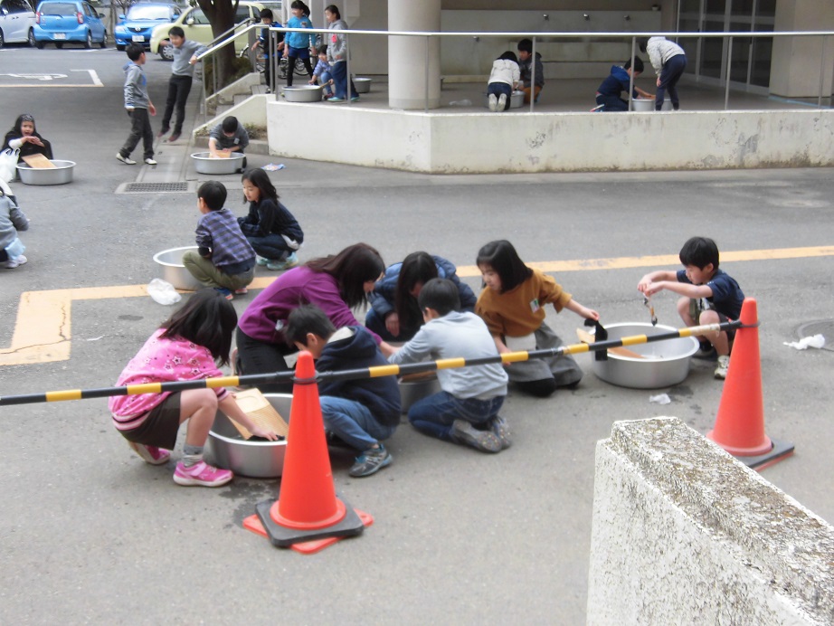 寒い中ですが、3年生は、洗濯板で洗濯体験を! 本当に大変だった、昔の人の生活を味わう機会になりました。