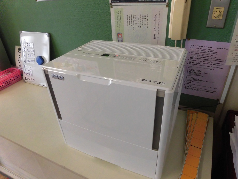 そこで、今年は、PTAの資源回収の収益から、各学級に加湿器を購入していただきました。 (※ 加湿機能ですが69㎡まで可。64㎡の教室もOKです。)