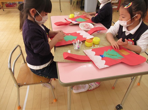 4歳児は、ギザギザに切ったホイル折り紙や型抜きした画用紙の飾りをつけました。