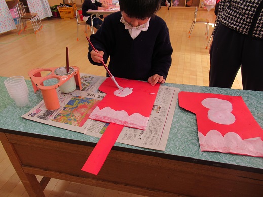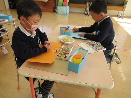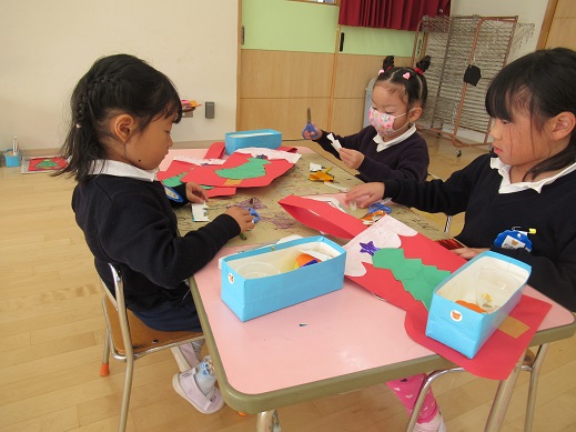 5歳児は、大きなプレゼントの箱を作っていきます。プレゼントを開けると、自分の欲しい物が見えるように描いていきました。