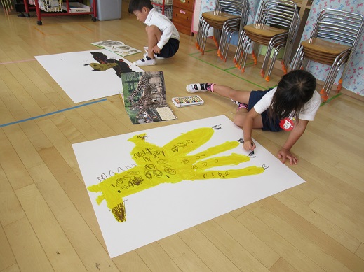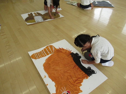 昨日の続きです。今日はクレヨンを使い、目や鼻・細かい体の模様などを描いていきました。