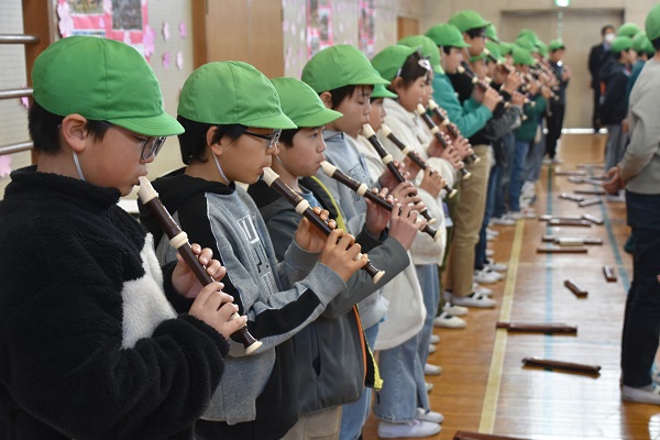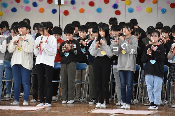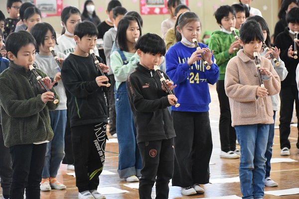 〇5年生の出し物。「がんばれ!」という気持ちを込めたエールと歌。後ろで支えるリコーダー隊。