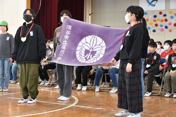 〇6年生から5年生へ校旗の委譲。「あとはまかせたよ!」「はい!」〇6年生の背中を見送ります。