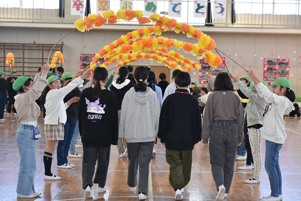 〇司会は5年生。 〇6年生の入場です。5年生がアーチを持って迎えます。