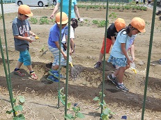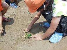 今日は2年生全員で、さつまいも植えとトウモロコシの種をまきました。