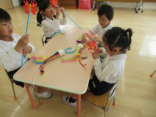 5歳児は、出来上がった2匹のこいのぼりと吹き流しを、矢車につけて完成です!