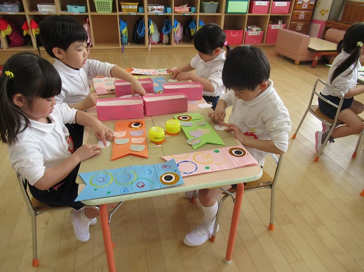 4歳児は、目玉をつけて、まだ模様のついていない画用紙に、うろこの形に切った千代紙を貼りて完成です!