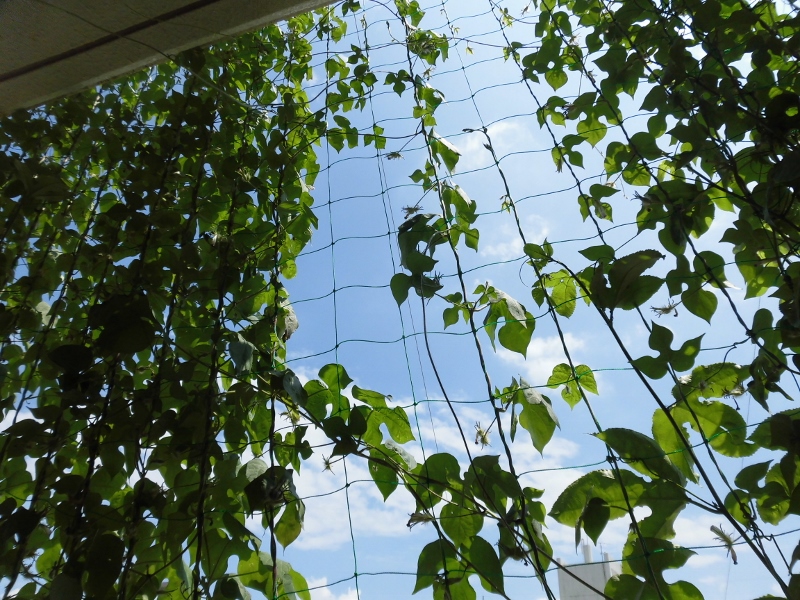 一つ目、 職員室前の緑のカーテン。 内側は、なんとなく、ひんやりします!