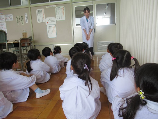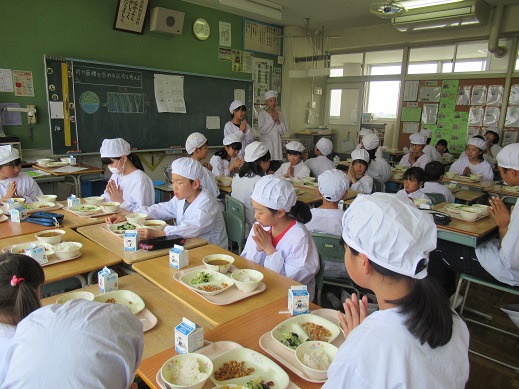 まずは、栄養士の先生のお話を聞きます。その後、グループごとに6年生のクラスへ入り、6年生のお兄さん・お姉さんと一緒に学校給食を食べました。