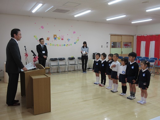園長先生のお話を聞いたり、進級児が園歌をうたったりしました。