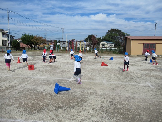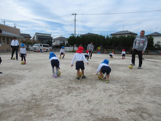 ゲームなどをしながら、楽しく体の動かし方を覚えていきます。ボールも一人一つずつ持って、投げたり転がしたりしながらボールに親しんだり、体から離れないようにボールをコントロールしたりと、体験しながらボールの扱い方を学びました。