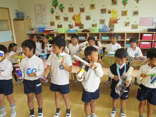 タイコやマラカス、ギターなど、自分で作りたい楽器を決めて、どうやったら音が出るかな?本物の楽器はどんな風だったかな?…いろいろ考えたり工夫したりしながら作りました。出来上がった自分の楽器を持って、みんなで音を鳴らして楽しみました!!