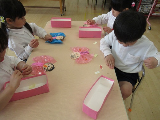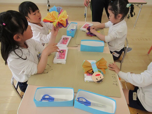 5歳児は、好きな色のお花紙を組み合わせて羽を作り、そこに小さいボンボンを飾ります。