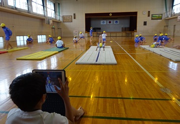 今日は体育のマット運動で、自分の演技を録画しました。