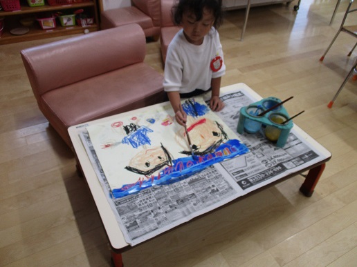 今日は、クレヨンと絵具を使って運動会の絵を描きました。