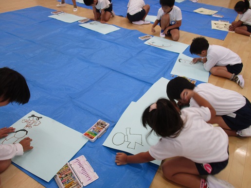 5歳児は、茶色や黒のクレヨンで絵の枠線を描きました。明日、絵具で色をつけていきます。
