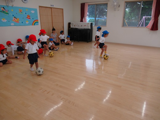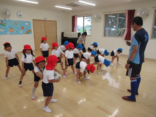 コーチが幼稚園に到着する頃に雨が降り出してしまい、急遽、遊戯室で行うこととなりました。