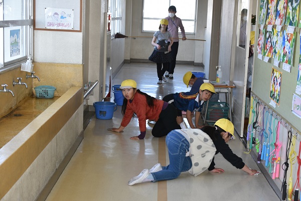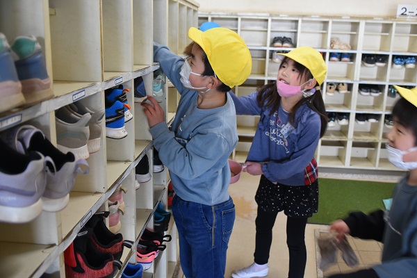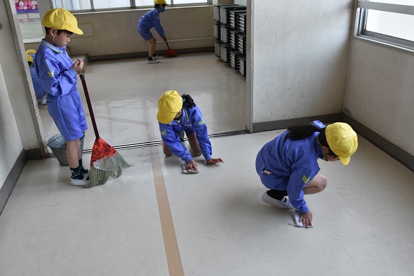 〇1,2年生の様子です。靴箱から昇降口、土が多いけれど丁寧に掃いたり拭いたりしています。